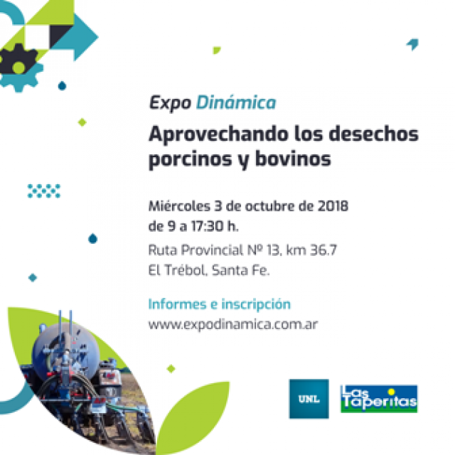 Bajo el lema “aprovechando los desechos porcinos y bovinos”, se llevará a cabo la Expo Dinámica, una iniciativa surgida en el marco de un proyecto de investigación y desarrollo llevado a cabo durante los últimos 4 años por la Universidad Nacional del Litoral (UNL), junto con la Empresa Las Taperitas SA, cuyo objeto principal es desarrollar un Plan de Manejo Integral de Desechos Pecuarios.