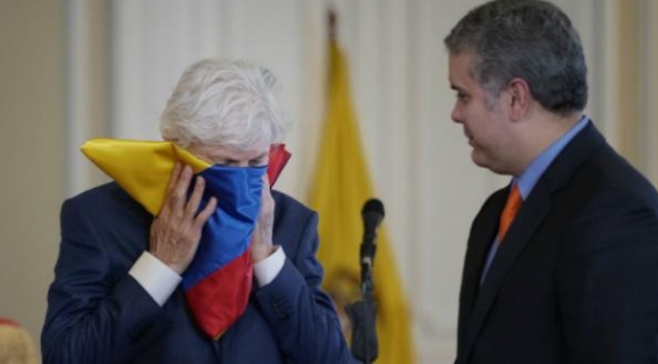 José Pekerman besó la bandera de Colombia y con ella se enjugó las lágrimas, tras recibirla el lunes de manos del presidente Iván Duque, en un emotivo acto de reconocimiento.