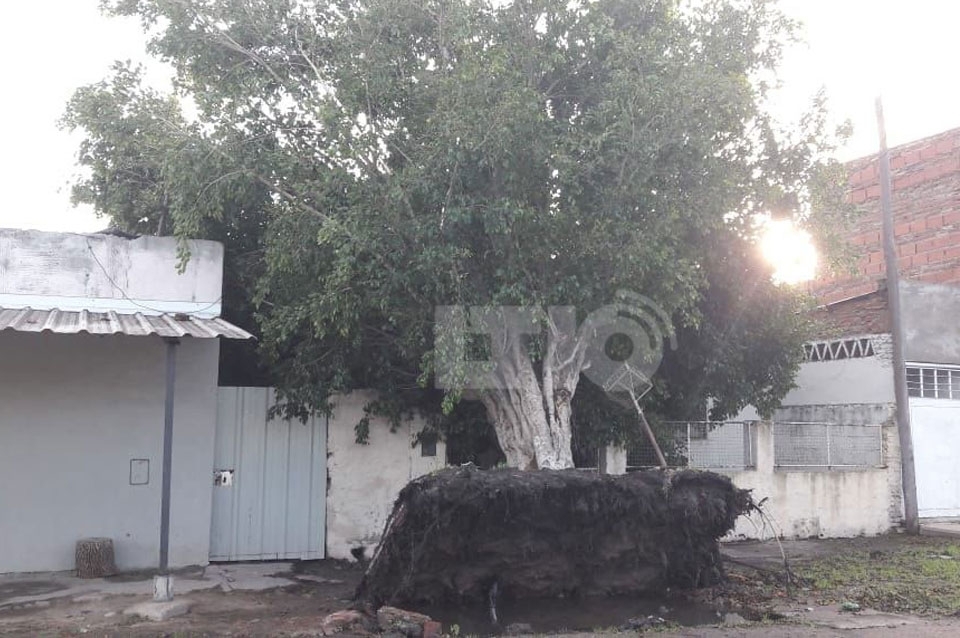 Desde el móvil, Verónica Ensinas captó la imagen de un árbol que se desprendió desde la raíz y cayó sobre una casa en barrio Centenario: