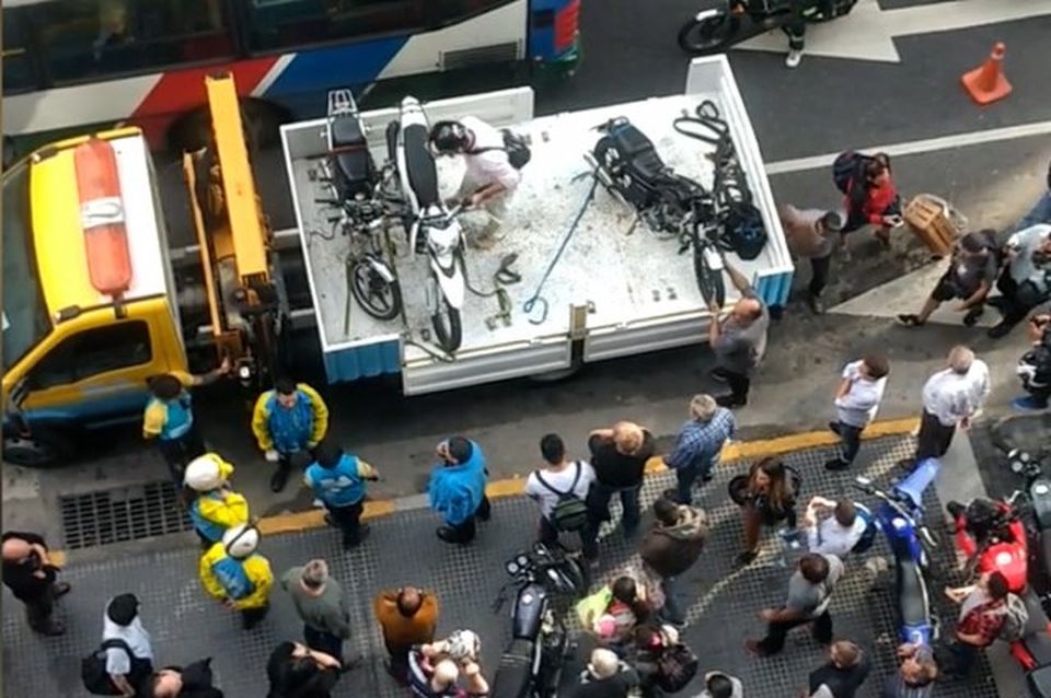 Ocurrió este martes en pleno microcentro porteño. Un hombre que cometió una infracción y a quien los inspectores le secuestraron la moto se subió a la grúa y sin respetar lo que le decían las autoridades se bajó con su vehículo y se fue.