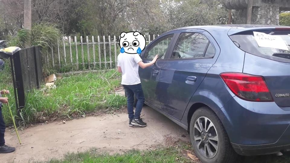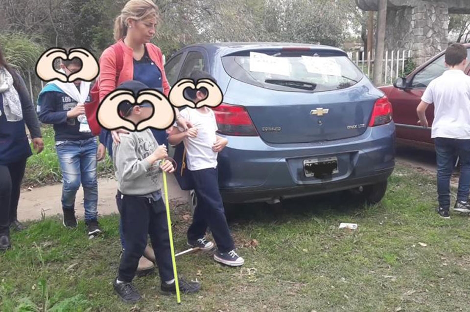 "Alumno con ceguera, utilizando la vereda de referencia...oooh primer obstáculo 'Un auto" (dice una de las maestras en su posteo en Facebook)