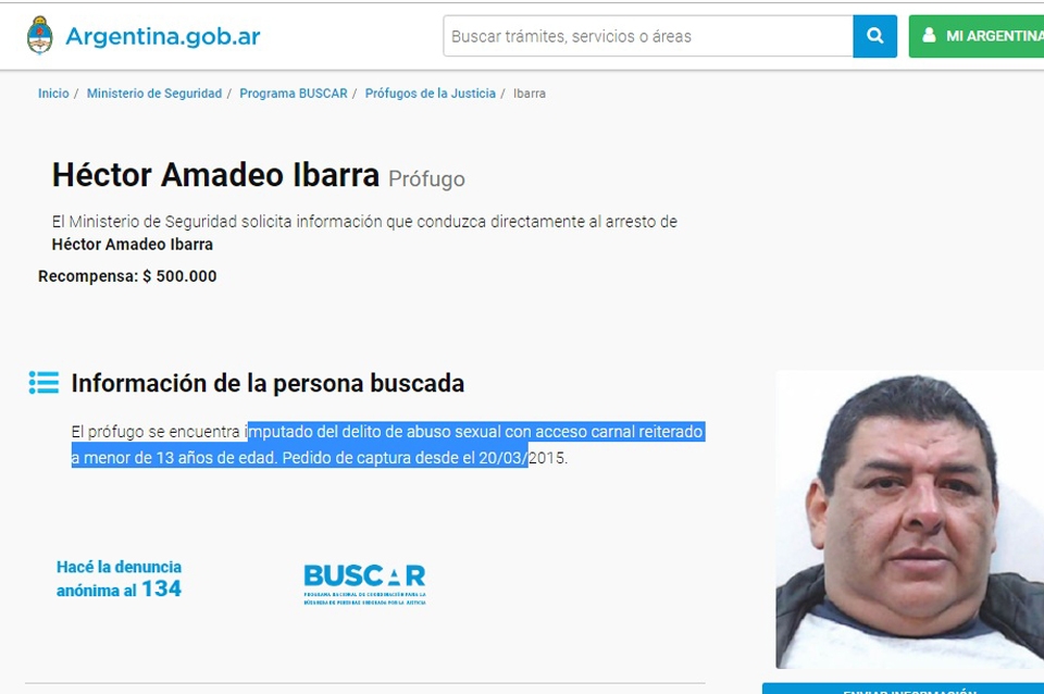 Tras una intensa búsqueda policial, que incluyó el pedido de captura internacional, el Ministerio de Seguridad decidió ofrecer una recompensa de 500.000 pesos a quien aporte información sobre el paradero de un hombre acusado por abuso sexual contra una menor de 13 años de edad en la ciudad de Vera. Se trata de Héctor Amadeo Ibarra.