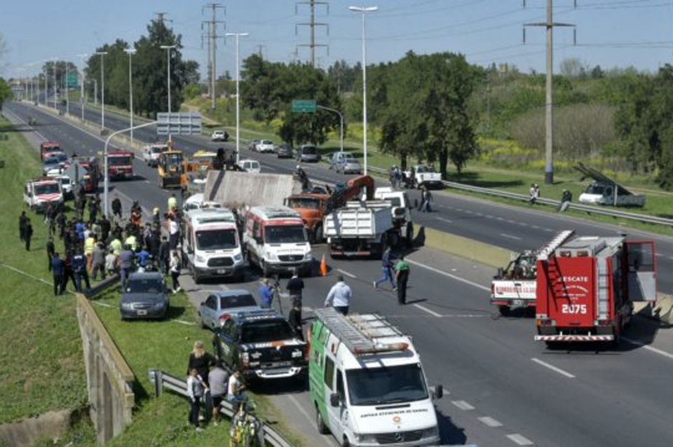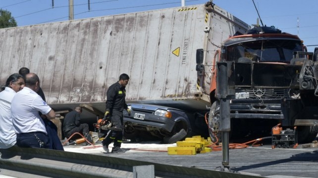 Un camión volcó y aplastó a un auto en el que una mujer y su madre quedaron atrapadas, por los que bomberos intentaban esta mañana rescatarlos, en la avenida de Circunvalación de la ciudad de Rosario.