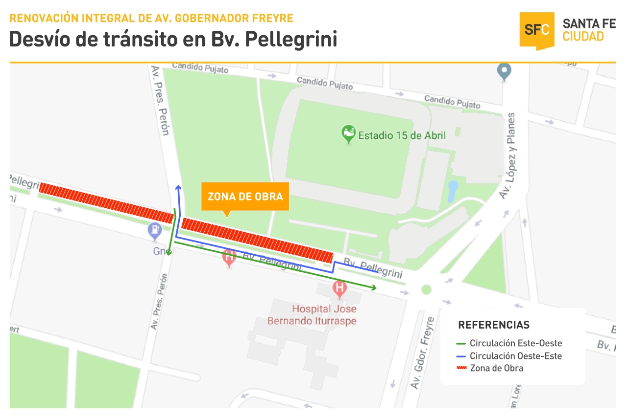 Desde el lunes 8 se interrumpirá la circulación vehicular del carril Norte de bulevar Pellegrini entre Av. Presidente Perón y la rotonda de accesos para ambulancias del Hospital Iturraspe (emplazada frente a la puerta de ingreso del centro de salud), debido a las obras de remodelación de Av. Freyre.