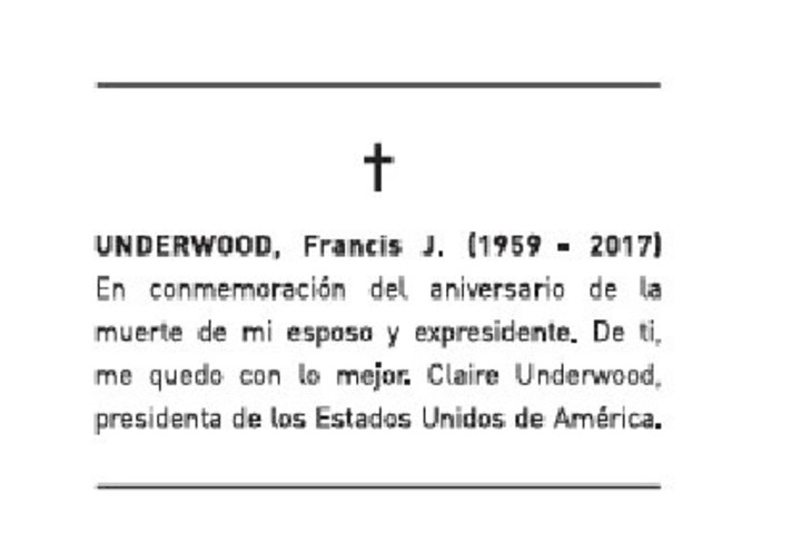 Este domingo 7, como parte de la campaña de publicidad de la serie, en las ediciones de papel de Clarín y La Nación apareció un aviso fúnebre conmemorativo del primer aniversario de su muerte. Lo firma Claire Underwood, presidenta de los Estados Unidos de América (según la ficción, claro).