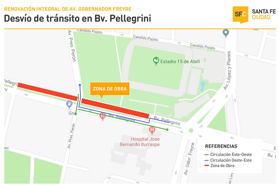 A partir de este lunes, el Municipio santafesino interrumpirá la circulación vehicular del carril Norte de bulevar Pellegrini entre Av. Presidente Perón y la rotonda de accesos para ambulancias del Hospital Iturraspe (emplazada frente a la puerta de ingreso del centro de salud). En tanto, inspectores de Tránsito realizarán un operativo en el carril Sur para garantizar la circulación en doble mano dentro del mismo (circulación Este-Oeste y Oeste-Este).