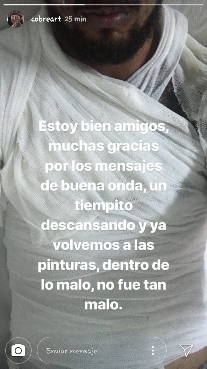 Tras el accidente, Andrés fue trasladado al hospital provincial donde quedó internado y recibe tratamientos específicos para este tipo de heridas. Intentando llevar tranquilidad, ayer "Cobre" publicó una imagen en sus redes sociales donde dio detalles de su estado de salud y agradeció las muestras de afecto recibidas:
