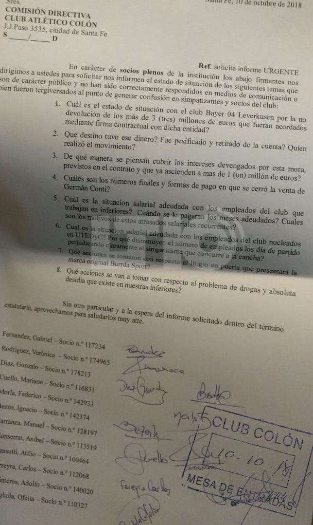 En la mañana de este miércoles ingresó por mesa de entrada de Club Colón una nota firmada por algunos socios con un pedido de explicaciones respecto a algunos temas inherentes a la actualidad de la institución. En resumen la carta es un pedido de explicaciones sobre las ventas de Lucas Alario y Germán Conti, deudas que tiene el club con empleados, la foto de los juveniles fumando marihuana en un viaje con el club y el caso de Burrda Sport.