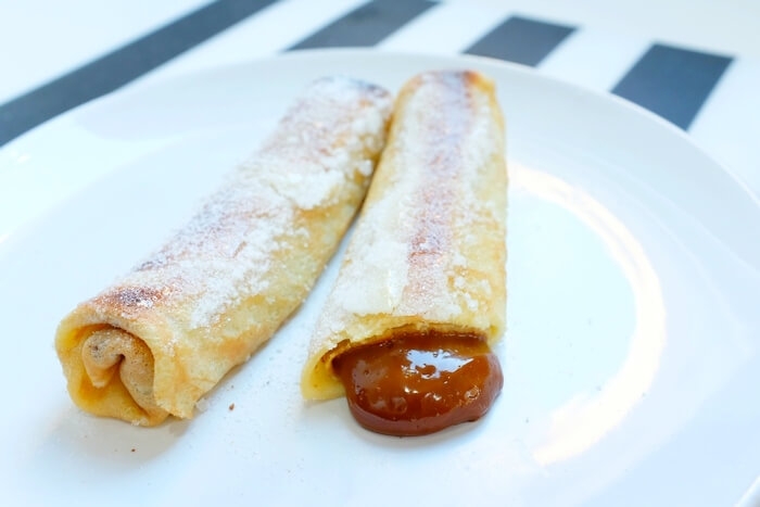 Una vez listos todos los panqueques, a mí me gusta rellenarlos en forma de rollito: poné 2 o 3 cucharadas grandes de dulce de leche en un extremo del panqueque sin llegar a los bordes