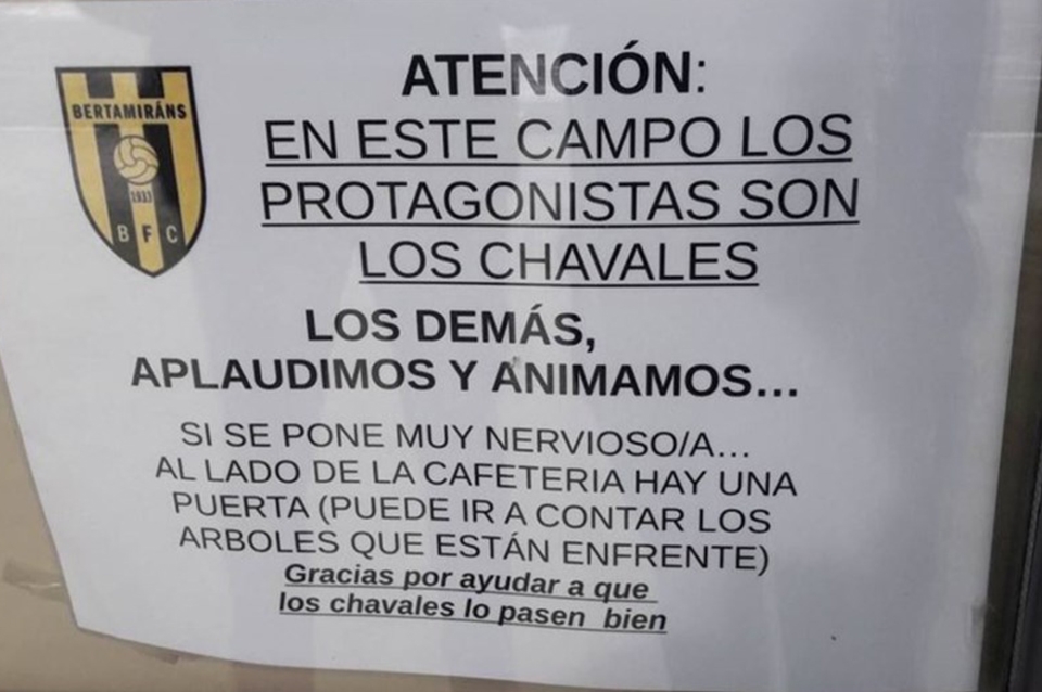 Bertamiráns, un club de fútbol de Galicia (España), soprendió a sus socios con un cartel con un claro mensaje para los padres que les gritan a los chicos cuando juegan al fútbol.