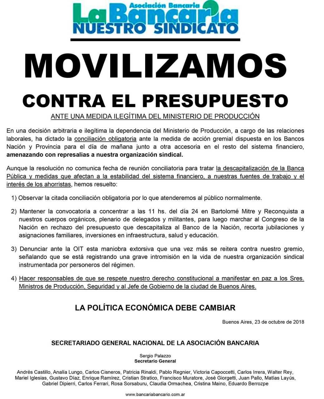 “Marchamos al Congreso Nacional para manifestarnos contra el Proyecto de Presupuesto del Hambre y del FMI”, añaden los sindicatos.