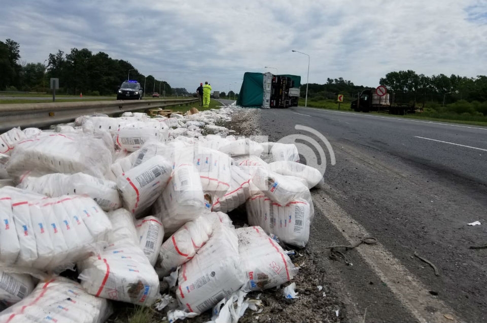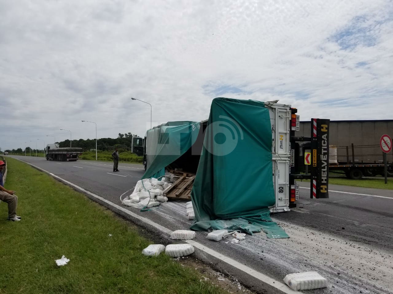 Tras la caída, el vehículo de gran porte perdió toda su carga sobre el asfalto. Eran paquetes de sal de una marca regional.