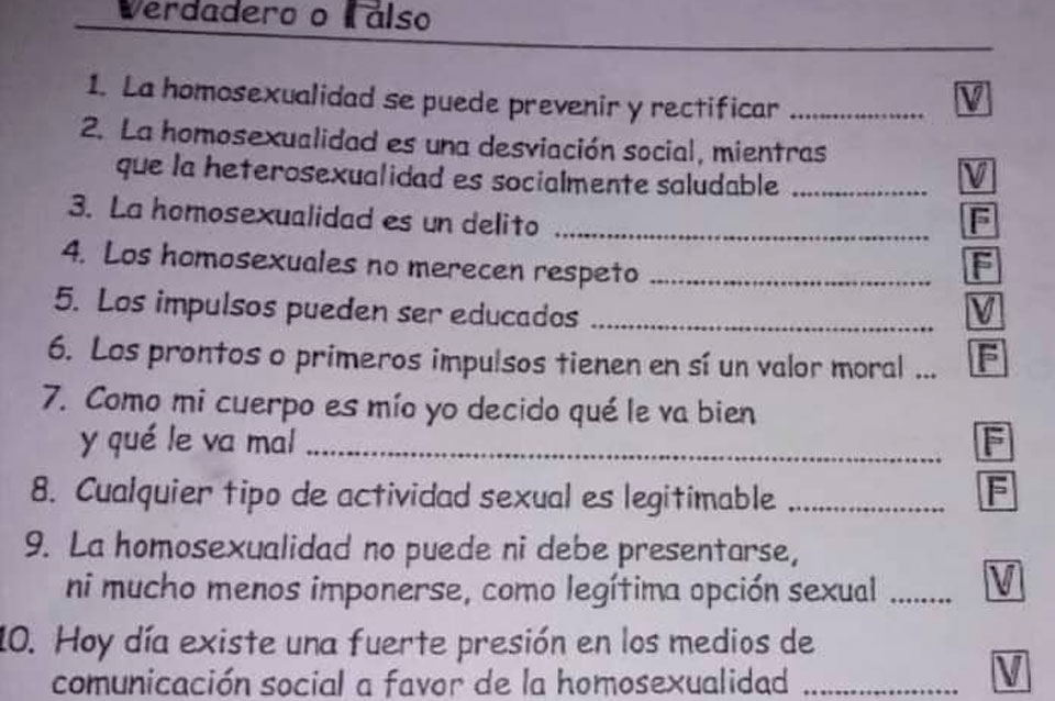 El cuestionario también menciona como "verdadero" que la homosexualidad es una desviación social, mientras que la heterosexualidad es "socialmente saludable". También dice que existe "una fuerte presión de los medios de comunicación social a favor de la homosexualidad".