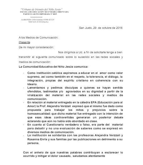La institución emitió este lunes un comunicado en el que explicó que el cuestionario apuntaba a funcionar como un disparador para "trabajar los mitos y perjuicios sobre la homosexualidad" y "que dicho material fue entregado con la intención de que esas ideas controvertidas generaran un posterior debate" pero que "aún no había sido abordado en clase".