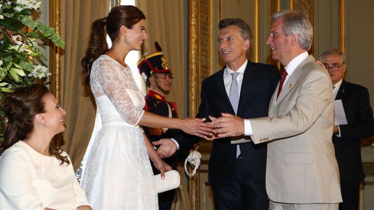 Macri y su esposa, Juliana Awada, saludaron uno por uno a los representantes de las delegaciones extrajeras que cumplen funciones diplomáticas en el país, además de otras que llegaron especialmente para acompañarlo en su asunción, entre ellos, todos los presidentes sudamericanos, con excepción del mandatario venezolano Nicolás Maduro, quien aseguró en su programa de radio que el flamante jefe de Estado "es un burgués de la elite al que le va a ir muy mal". También se destaca la ausencia de la reina de Holanda, Máxima Zorreguieta.