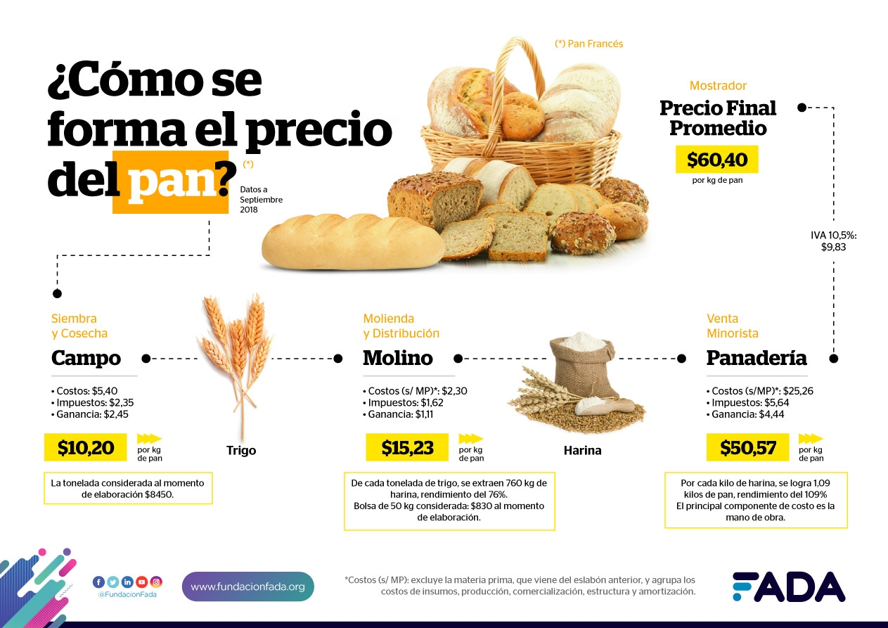 En el caso de los distintos eslabones productivos del pan, de acuerdo a INDEC el pan francés en septiembre tuvo un precio de $60,40 por kilogramo. De ese precio, el trigo representa el 13% del precio final ($7,86), el molino el 5,6% ($3,41), la panadería el 49,2% ($29,70) y los impuestos el 32,2% ($19,43).