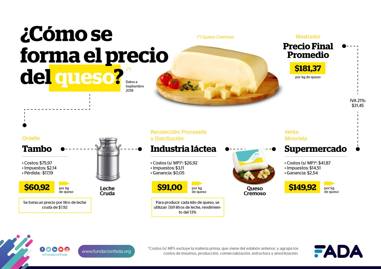 • El queso cremoso en septiembre tuvo un precio de $181,37 por kilogramo de ese precio el tambo explica el 32,4% del precio final, la industria el 14,9%, el comercio el 24,5% y los impuestos el 28,2%.