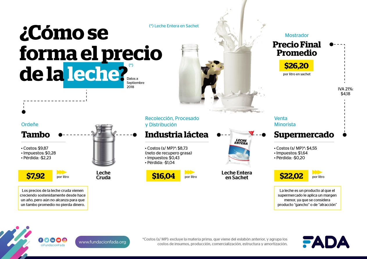 El sachet de leche entera, promediando una primera y una segunda marca, en septiembre tuvo un precio promedio de $26,19 por litro, de ese precio el tambo representa el 29,2% del precio final ($7,64), la industria el 29,3% ($7,68), el comercio el 16,6% ($4,35) y los impuestos el 24,9% ($6,52).