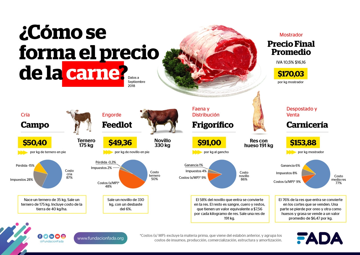 • Del precio final de la carne, el 69% son costos de la cadena, 29,8% impuestos y 1% ganancias.