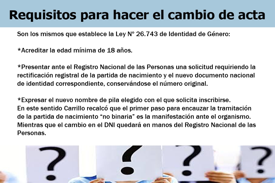 En este sentido Carrillo recalcó que el primer paso para encauzar la tramitación de la partida de nacimiento “no binaria” es la manifestación ante el organismo. Mientras que el cambio en el DNI quedará en manos del Registro Nacional de las Personas.