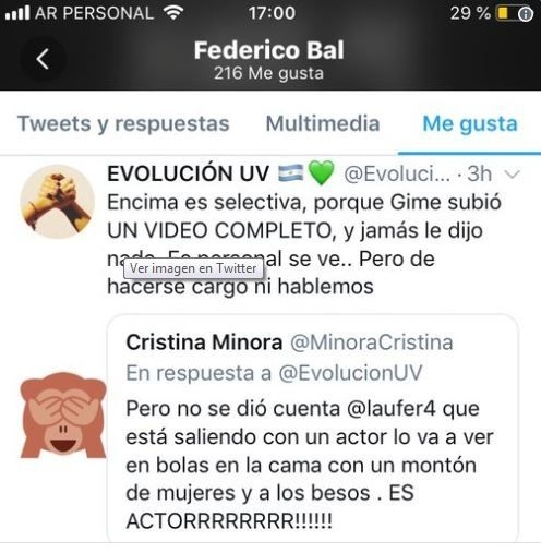 Pese a que el cruce parecía ser solo de dos, terminó en manos de varios actores y actrices de la farándula que saltaron a dar su opinión. Uno de ellos fue Federico Bal, aunque lo hizo de forma indirecta dando "me gusta" al mensaje de una usuaria que disparó lapidaria: "Pero no se dio cuenta Laura que está saliendo con un actor? Lo va a ver en bolas en la cama con un montón de mujeres y a los besos. ¡Es actor!". ¿La banca a Vigna?