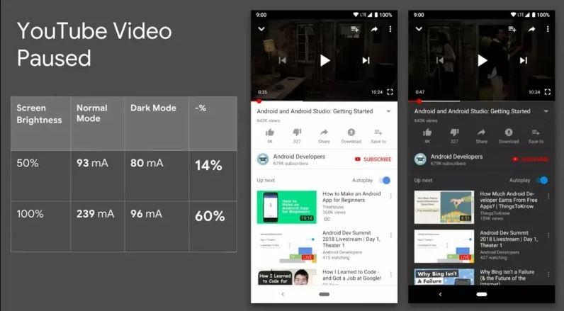 En una convención de desarrolladores Android se demostró que, por ejemplo, al reproducir un video en YouTube, en pantalla completa y con el brillo al 100 %, el equipo consumió 239 mAH. Al hacerlo igual pero con el modo oscuro activado gastó 96 mAh.