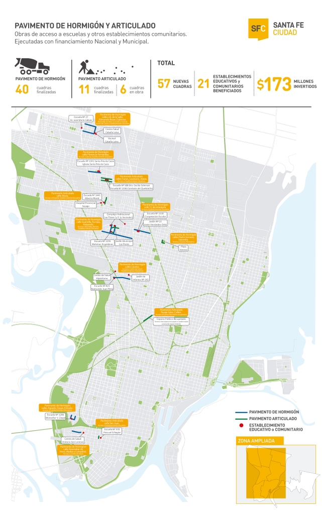 Con esta primera concretada del Plan concretada, se consolidaron vías de circulación Este - Oeste y Norte – Sur, garantizando una transitabilidad segura y fluida para el tránsito vehicular y peatonal, en particular de los niños, niñas, jóvenes y docentes que asistes en los establecimientos educativos, incluso en días de lluvia. Cabe indicar que la inversión total comprende $143 millones en calles de hormigón y $ 30 millones en pavimento articulado financiado por el Ministerio del Interior, Obras Públicas y Vivienda de la Nación.
