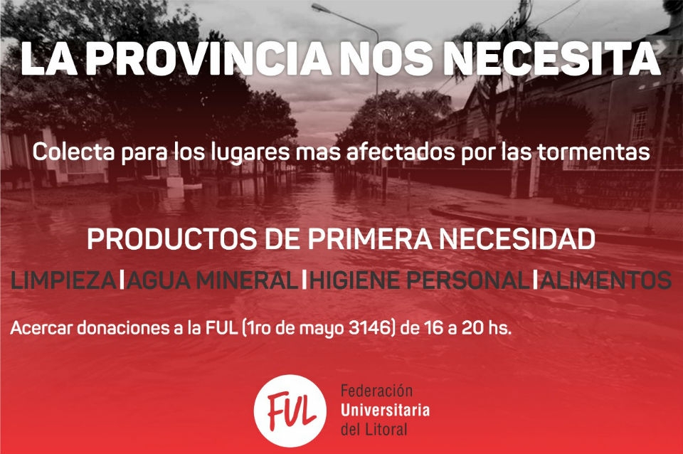 Bajo la consigna “¡La Provincia nos necesita!”, la Federación Universitaria del Litoral organiza una colecta solidaria para llevar ayuda a las localidades santafesinas damnificadas por el temporal de estos días.