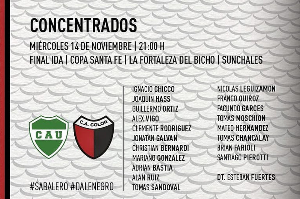 Esteban Fuertes diagramó la lista de los jugadores que van a viajar esta tarde a las 17:00 hs para enfrentar a Unión de Sunchales por el partido de ida de la final de la Copa Santa Fe 2018. El posible equipo titular es: Ignacio Chicco; Alex Vigo, Guillermo Ortíz, J. Galvan, Clemente Rodríguez; Christian Bernardi, Adrián Bastía, Mariano González; Alan Ruiz; Tomas Sandoval, Nicolás Leguizamón.