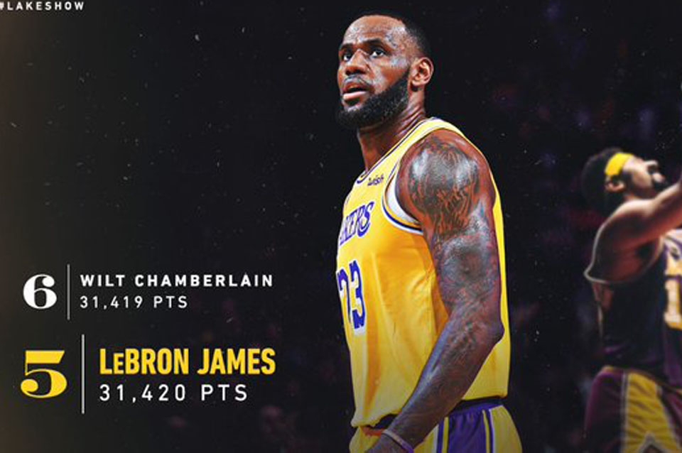 Sin embargo ese punto convertido por James, el 39 que conseguía en la noche (luego lograría 5 más), no era un punto más, era el punto que le permitía desalojar del quinto lugar de la tabla de goleadores históricos de la NBA a otro hombre que utilizó la camiseta púrpura y amarilla de los Lakers, Wilt Chamberlain.