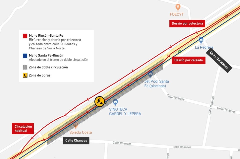Por este motivo, la municipalidad dispuso un desvío en la mano que va del Norte hacia el Sur, por la colectora Oeste. En tanto, en la mano que va desde el Sur hacia el Norte entre calles Chanaes y Quiloazas, se realizará una reducción de calzada para generar un doble sentido de circulación.