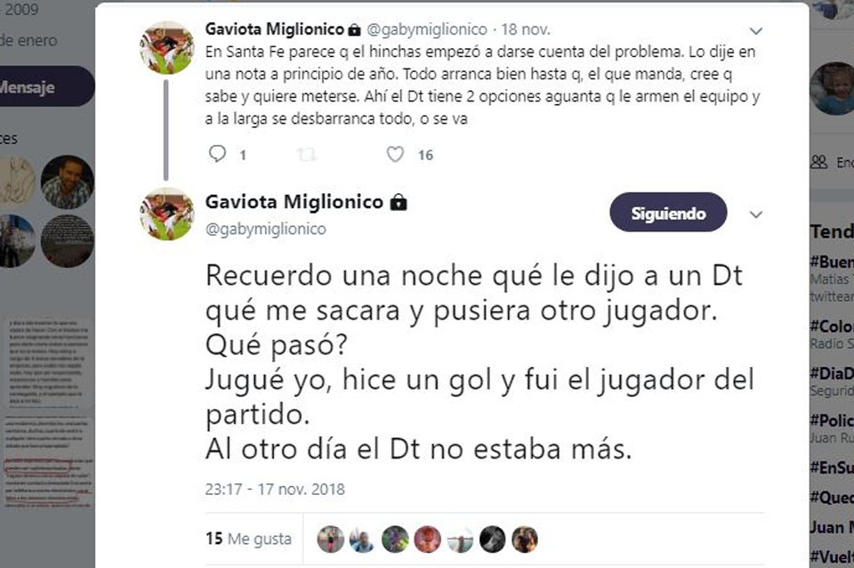Luego de la derrota de Colón ante Unión de Sunchales, donde Javier Correa y Matías Fritzler apuntaron algunas culpas hacia la dirigencia de Colón, “Gaviota” salió al cruce del presidente José Vignatti y sin nombrarlo contó: “En Santa Fe parece q el hinchas empezó a darse cuenta del problema. Lo dije en una nota a principio de año. Todo arranca bien hasta q, el que manda, cree q sabe y quiere meterse. Ahí el Dt tiene 2 opciones aguanta q le armen el equipo y a la larga se desbarranca todo, o se va”.