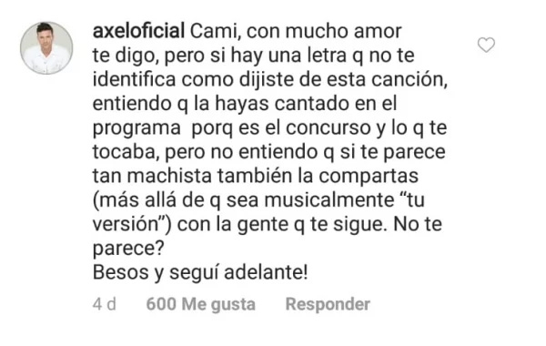 Tras las repercusiones que generó los dichos de la neuquina, Axel respondió dirigiéndose hacia la joven: "Cami, con mucho amor te lo digo... Si hay una letra que no te identifica, como dijiste de esta canción, entiendo que la hayas cantado en el programa porque es el concurso y era lo que te tocaba. Pero no entiendo que si te parece tan machista también la compartas con la gente que te sigue (más allá de que sea musicalmente “tu versión”). ¿No te parece? Besos y seguí adelante".