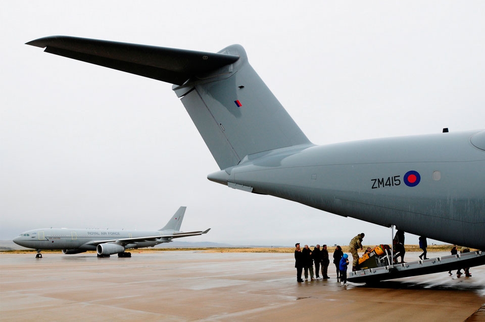 Desde 1999 existe un vuelo a las islas que hace escala una vez por mes en el continente, en Río Gallegos.