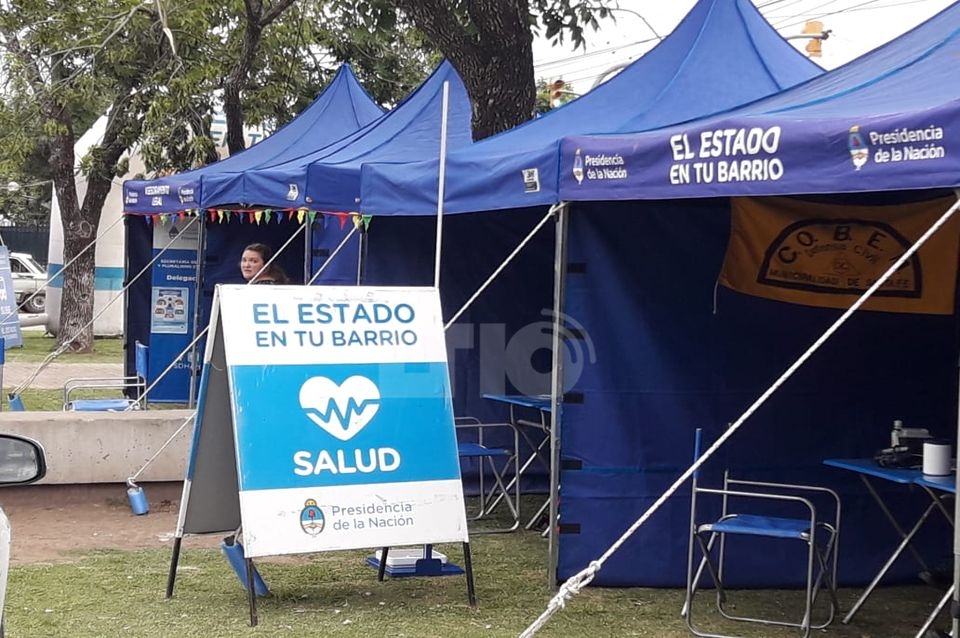 En la plaza que se encuentra delante del Jardín Municipal de Las Flores se desarrolla esta semana el Estado en tu Barrio, programa tiene como objetivo ofrecer a los vecinos de la Ciudad la oportunidad de realizar -con mayor rapidez y cerca de sus casas-, distintos trámites de organismos nacionales y municipales.