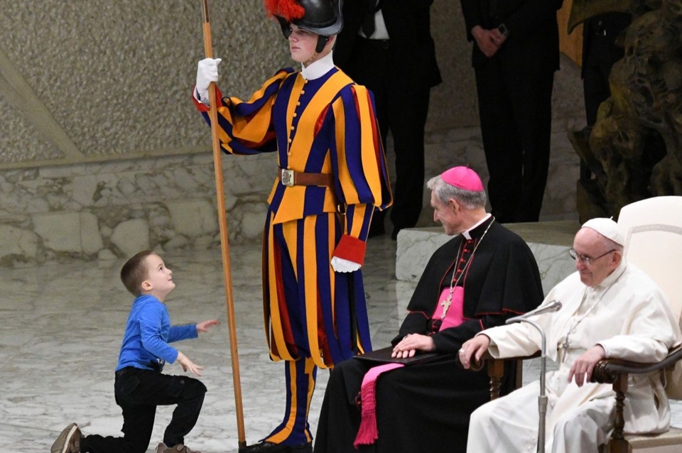 En el video se puede ver cómo el niño tira la mano enguantada de un guardia suizo y juega detrás de la silla del Papa Francisco.