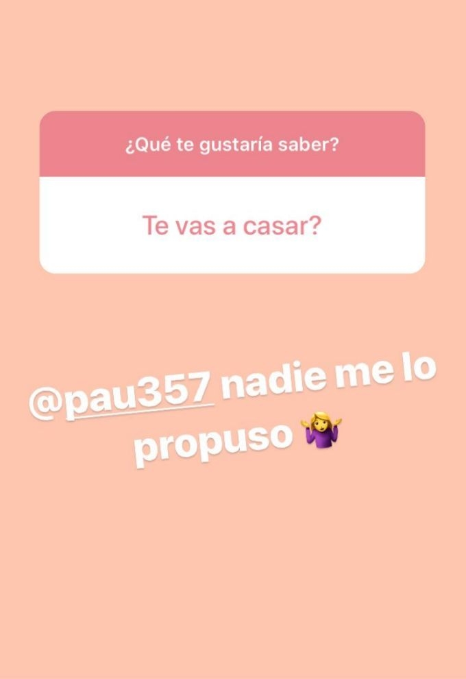 ¿Qué piensa Romina? Pereiro se animó a responde las preguntas de sus seguidores a través de Instagram Stories y cuando uno de ellos le preguntó si se iba a casar, ella respondió con picardía: “Nadie me lo propuso”, junto al emoji de una mujer levantando los hombros y las manos.