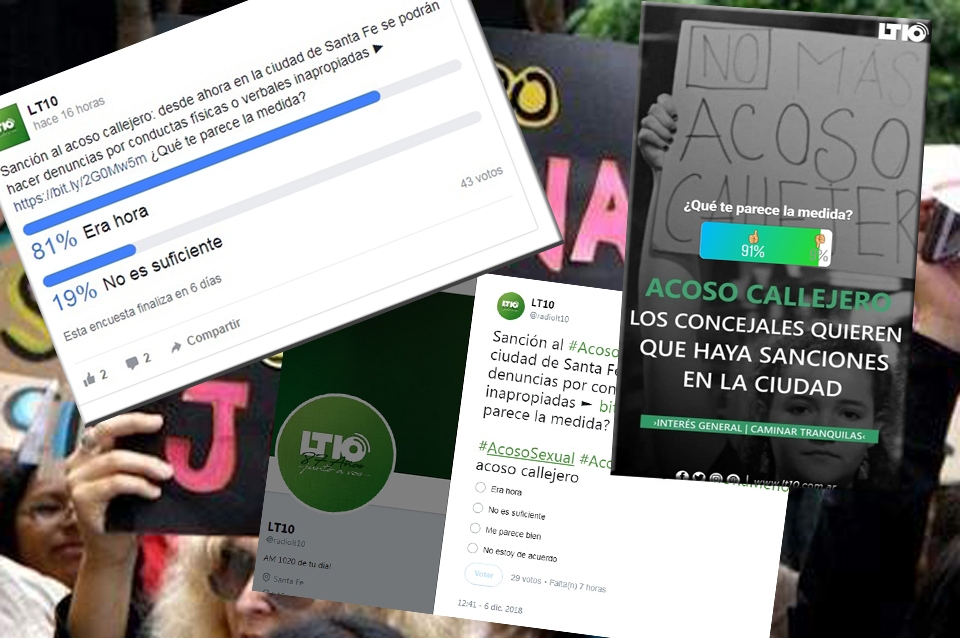En Twitter la encuesta está abierta y los santafesinos pueden dejar su voto en el sitio oficial de LT10. La iniciativa fue impulsada por la concejala Rossana Ingaramo y busca “promover una cultura asentada en el respeto y la asunción de nuevas prácticas de convivencia y de comportamientos responsables; articular acciones de concientización con instituciones y organismos que trabajan en la temática; y promover derechos de seguridad de las mujeres y de la diversidad sexual”.