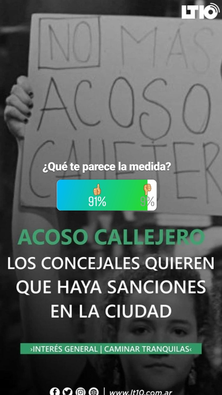 Para finalizar Instagram también dio sus números ante la encuenta propuesta por LT10 con respecto al acoso callejero. Los usuarios de la red social mostraron números contundentes tras la consulta por la medida. El 91% está a favor de la medida y sólo el 9 está en contra.