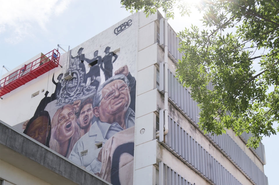 La obra demandó el trabajo de cinco semanas, a jornadas completas de sol a sol, y se realizó íntegramente con la técnica de mural grafitti. La parte de grafitti es el uso de aerosol y la técnica es muralista porque comprende una escena y retratos hiperrealistas.