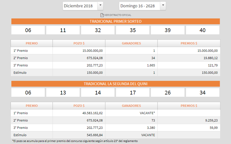 Anoche, durante el Sorteo N° 2628 de Quini 6 un sólo apostador se llevó el premio de seis aciertos del “Tradicional Primer Sorteo” adjudicándose la increíble suma de $15.000.000. Los números acertados para el pozo mencionado fueron el 06-11-32-35-39-40.