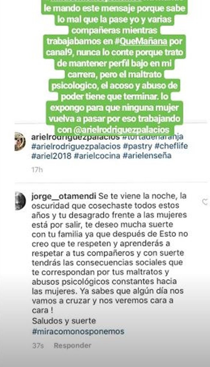 Geraldine compartió el mensaje en sus historias de Instagram y agregó: “Se lo mal que la pase yo y mis compañeras mientras trabajábamos en Qué mañana por Canal 9. Nunca lo conté porque siempre traté de mantener perfil bajo en mi carrera, pero el maltrato psicológico, el acoso y el abuso de poder tienen que terminar. Lo expongo para que ninguna mujer vuelva a pasar por lo mismo trabajando con Ariel Rodríguez Palacios".