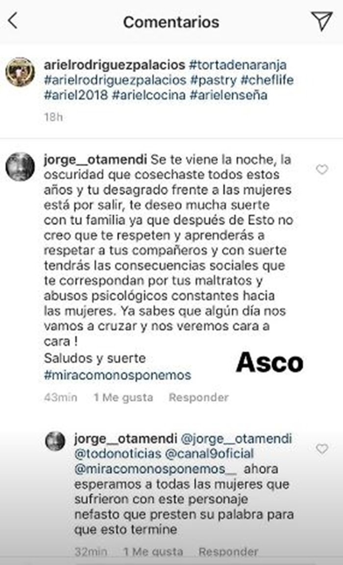 "Se te viene la noche, la oscuridad que cosechaste todos estos años y el desagrado frente a las mujeres está por salir. Con suerte tendrás las consecuencias sociales que te corresponden por tus maltratos y abusos psicológicos a las mujeres", comentó Otamendi en la cuenta de Palacios.