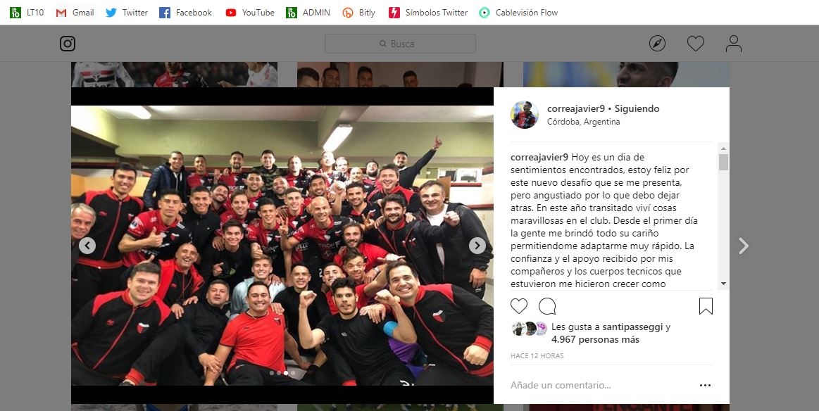 En sus redes sociales Javier Correa se despidió del club y agradeció, entre otras personas, al hincha sabalero: “Hoy es un día de sentimientos encontrados, estoy feliz por este nuevo desafío que se me presenta, pero angustiado por lo que debo dejar atrás. En este año transitado viví cosas maravillosas en el club. Desde el primer día la gente me brindó todo su cariño permitiéndome adaptarme muy rápido. La confianza y el apoyo recibido por mis compañeros y los cuerpos técnicos que estuvieron me hicieron crecer como profesional y me abrieron las puertas de lo que viene. Les Agradezco mucho a todos! Dirigentes, empleados del club, pero principalmente al hincha que siempre estuvo y nos acompañó y son quienes hacen que Colon sea un grande de Verdad #Graciasatodoslossabaleros”