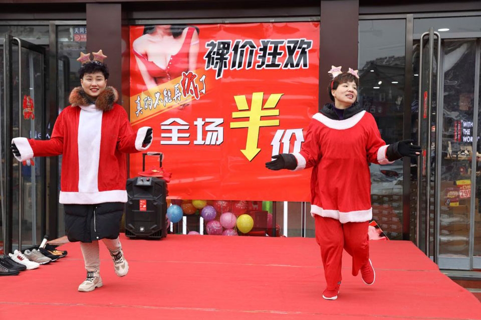 El personal de ventas de una tienda de ropa baila con trajes navideños para promover las ventas de fin de año en Zhangjiakou, en la provincia de Hebei, en el norte de China. Al menos cuatro ciudades chinas y un condado han restringido las celebraciones navideñas este año