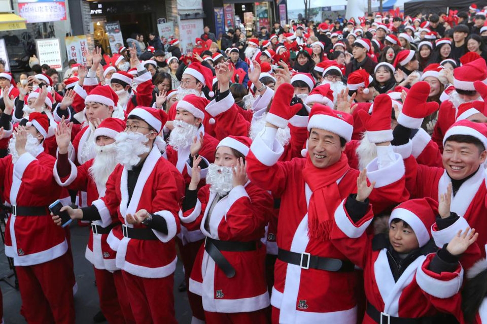 Voluntarios vestidos con trajes de Papá Noel se reúnen para entregar regalos a los pobres en el centro de Seúl, Corea del Sur.