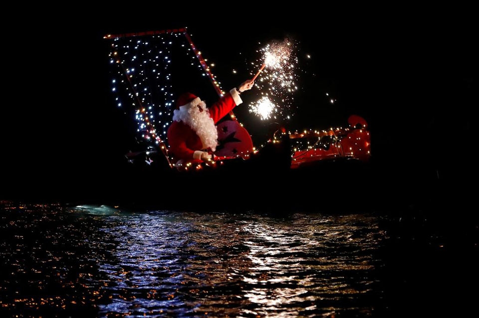 Cristianos árabes israelíes vestidos de Papá Noel esperan el comienzo del desfile anual de Navidad en Nazaret, Israel.