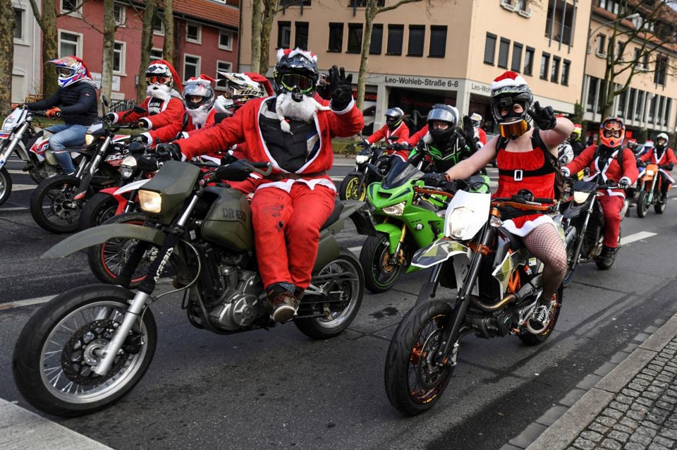 Miembros de un club de motociclistas con trajes de Papá Noel en sus motos en Friburgo, al sur de Alemania.