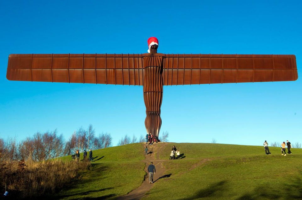Un sombrero de Papá Noel se ve en la escultura de acero "Ángel del Norte", en las afueras de Gateshead, en Inglaterra.
