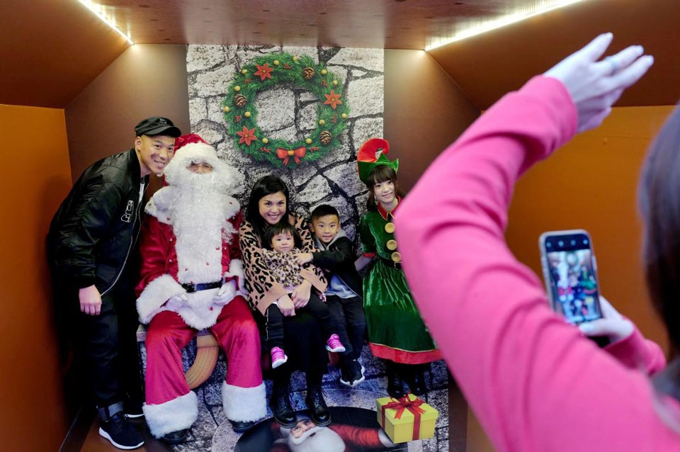 Una familia posa para una foto con Papá Noel en un centro comercial en Hong Kong